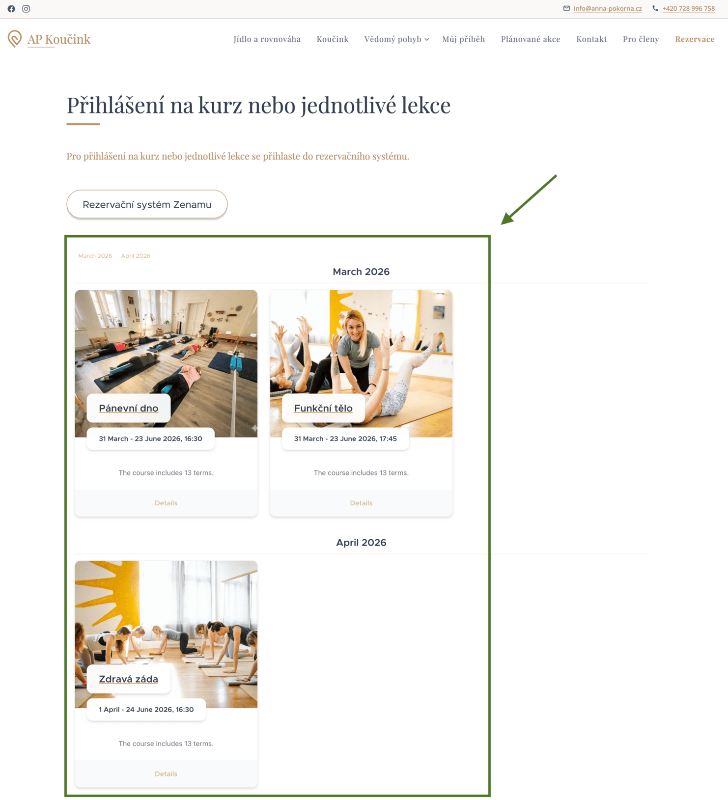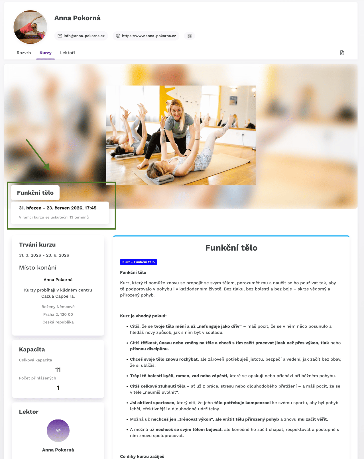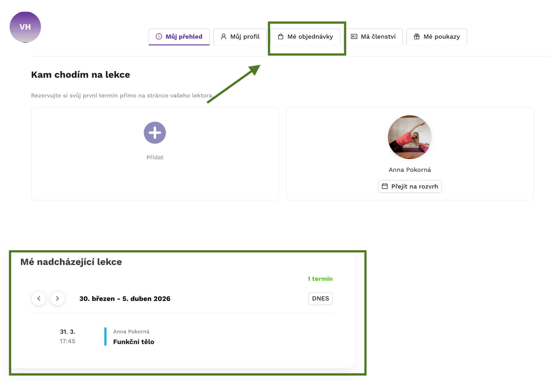 13. Ve svém profilu v levé dolní části vidíš všechny lekce, na které jsi přihlášena. Můžeš se posouvat šipkami v datech dopředu nebo dozadu podle potřeby,