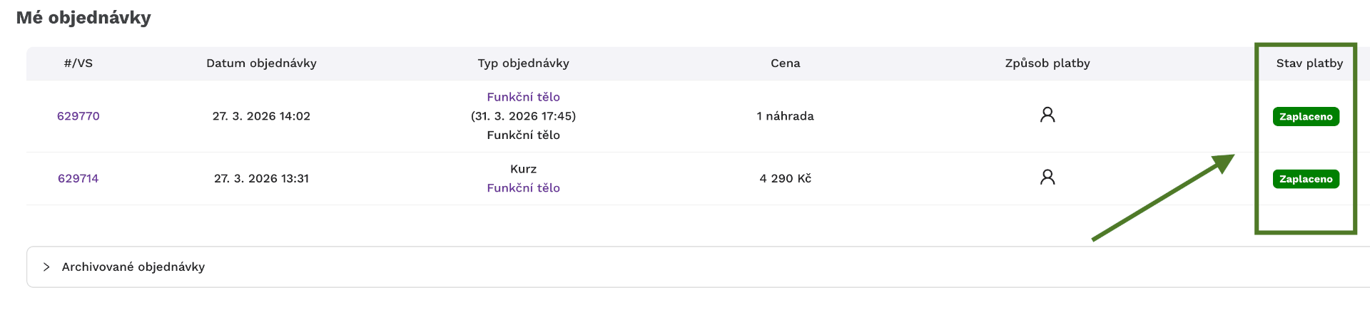 9. Po registraci se ti na detailu kurzu zobrazí nová část pod "objednávka kurzu"