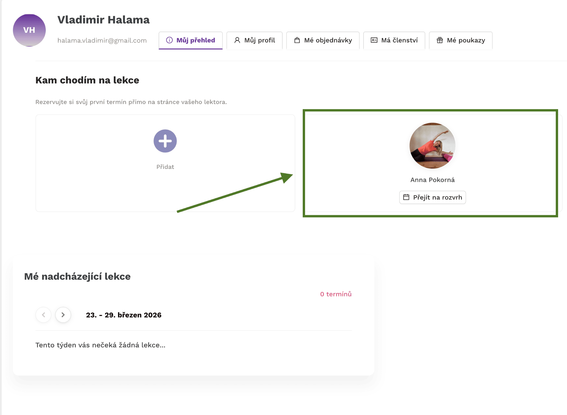 14. Aktivní rezervaci uvidíš i na úvodní přhledové stránce svého profilu v seznamu "mé nadcházející lekce".