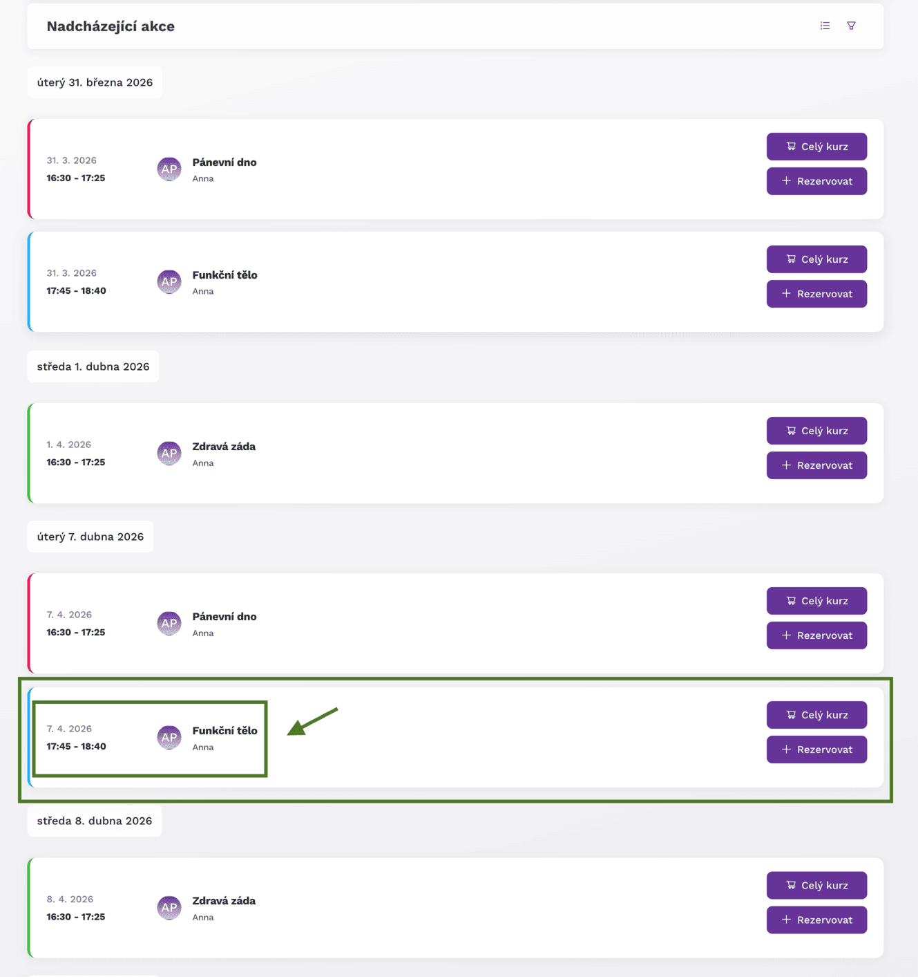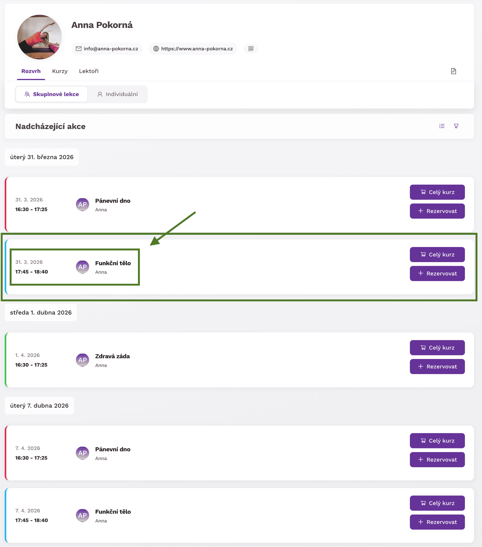 3. V části rozvrh / skupinové lekce uvidíš všechny mé lekce ve všech kurzech, které probíhají v daném termínu.