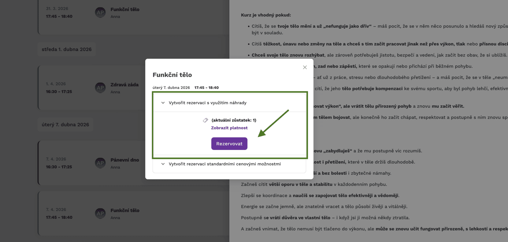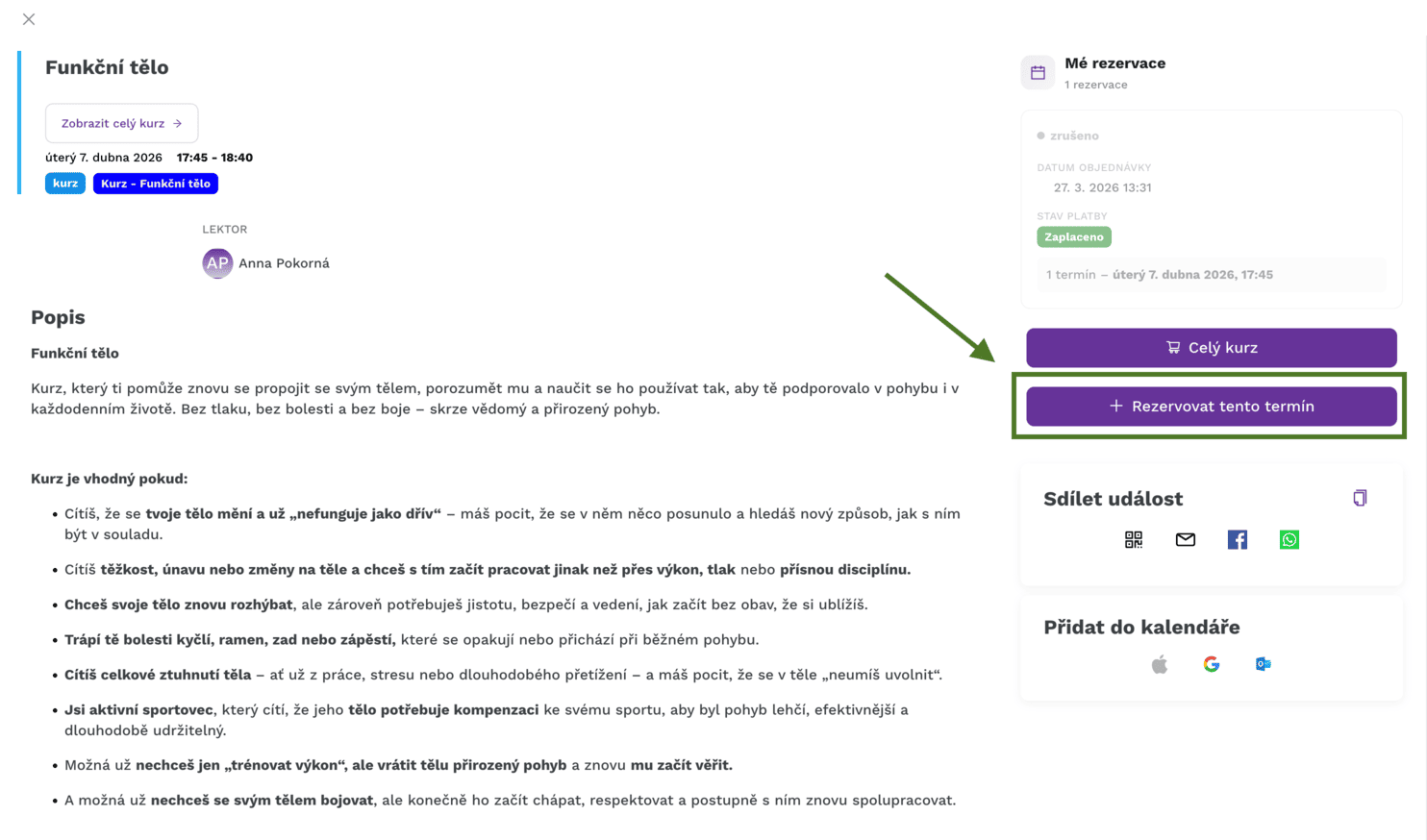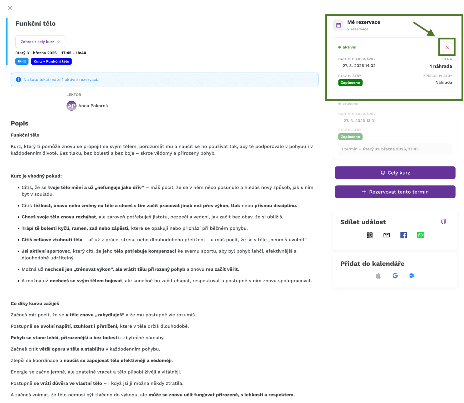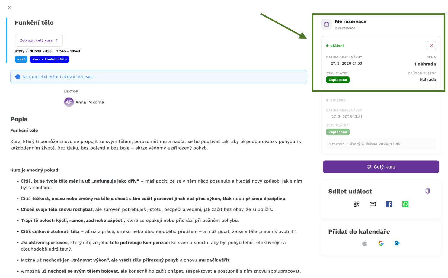 13. V detailu dané lekce uvidíš svou aktivní rezervaci.